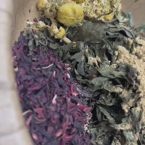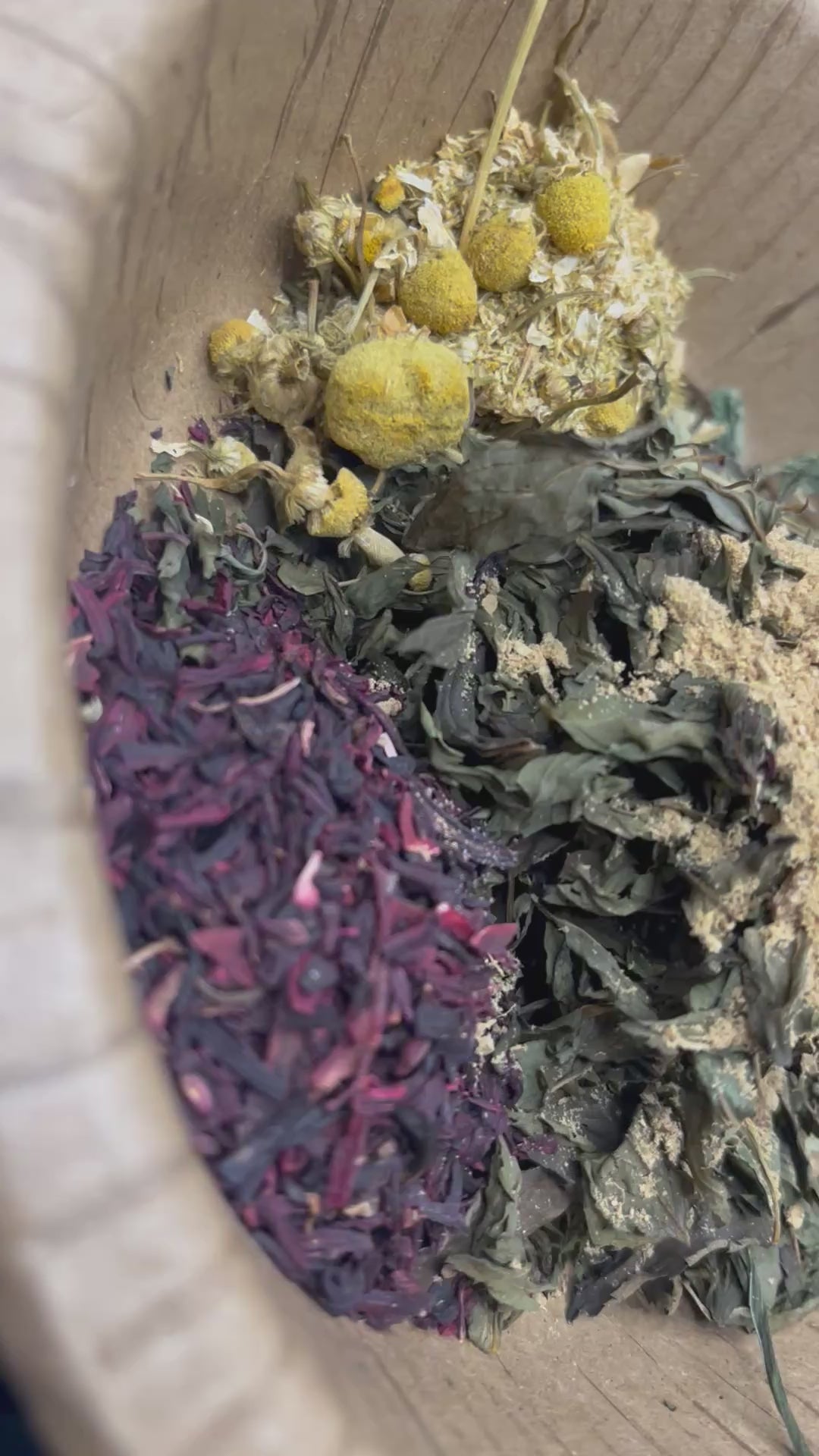 Hand-blended with: Peppermint, Lemon Balm, Ginger, Chamomile, Hibiscus